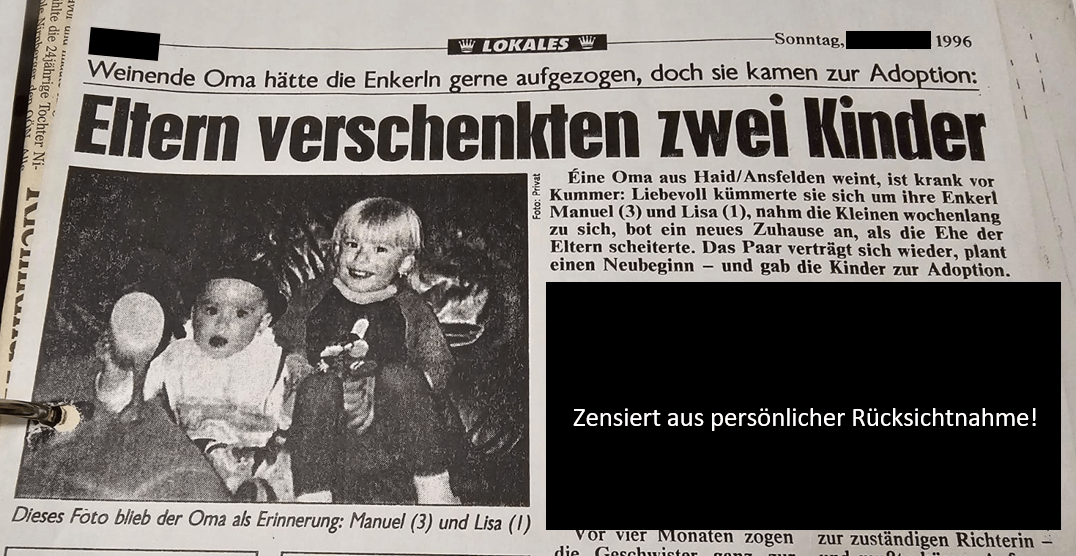 Nach der Geburt meiner Schwester Lisa im Jahr 1995 entschlossen sich unsere Eltern, einen Neustart zu wagen. Einen Neustart ohne eigene Kinder und so wurden wir 1996 zur Adoption freigeben.